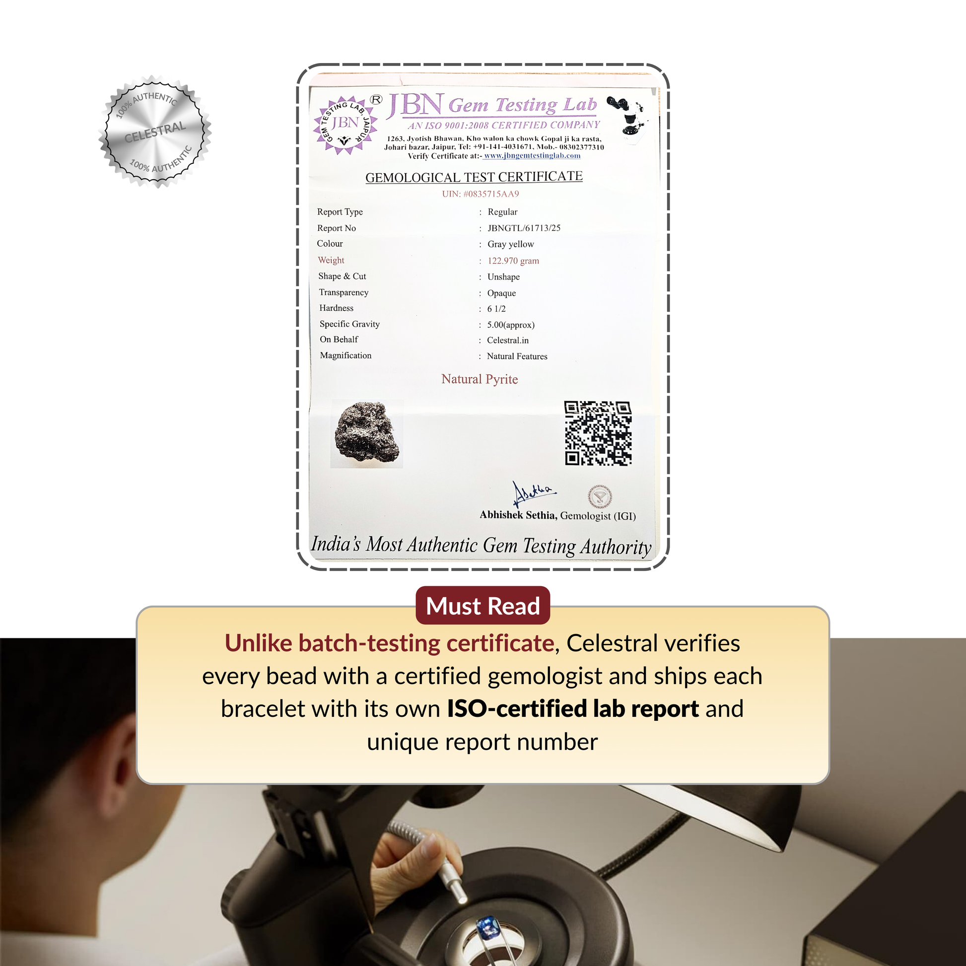 Every Akshmala piece is individually tested by ISO-certified independent labs. Each product ships with its own authenticity certificate and a certificate ID. You can check the certificate details included with your order or contact our support team and we will help verify the certificate for you.